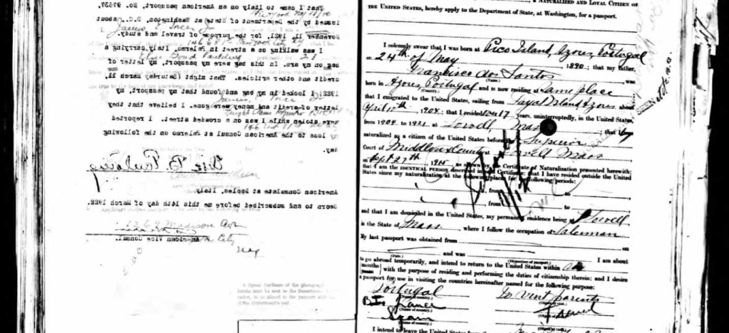 So first, the myth and the truth. There had been a family story for many years that upon arrival from Portugal my grandpa took his wife’s maiden name. Since there is no evidence of anyone from my family exchanging names, this is a myth that was not true. Also, my grandpa was born in Petaluma CA, it was Francisco Francis Santos, my grandpa’s grandpa, that immigrated to CA in 1868 and then married a Portuguese woman named Mary Perry. They were married at the Saint Vincent De Paul church in Petaluma CA on Oct. 27, 1873. Francisco and Mary lived in Petaluma with Mary’s parents for a time. Francisco and Mary had five children, one of whom died young. Annie Leal was their adopted daughter who immigrated herself from the Azores Portugal. Annie was 7 when she came from Portugal. Together the family was involved in the poultry business. Francisco and Mary moved from the farm to a house in town late in life when Francisco was 68, the year before he died, and Mary was 67. William P Santos lived with them at the time. Frank Francis Santos, the second child of Francisco and Mary had taken over the poultry farm. Many of the graves for this family can be seen at the Calvary Catholic Cemetery in Petaluma CA.