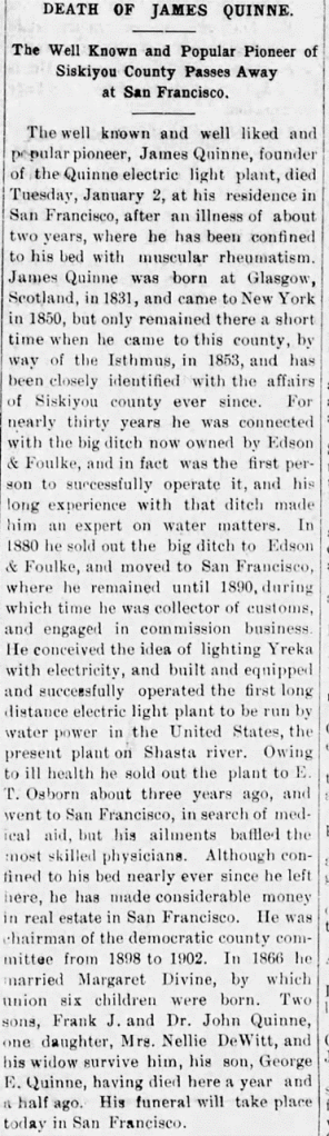 James was the founder of the Quinne Electric Light plant, the first electric light plant in Siskiyou County. James was connected with the “big ditch” which was sold to Edson and Foulke in 1906. He was the first person to operate the canal making him an expert in water movement. In 1880 the Big Ditch was sold by Quinne when he moved to San Francisco where he became the Collector of Customs and engaged in commissioned businesses. In 1890 he relocated back to Siskiyou County and built the first hydroelectric power plant in the United States known as the Shasta River Power Plant (in 1906). The Quinne Power Company was important to the local community. The Overland Monthly noted in 1897 the size of the plant and that Mr. Quinne had been ridiculed for his plan to build the power plant. The Mining and Scientific Press took exceptional note of the works of Quinne in both water management and power supply. Quinne had been called on to supply water to new mining ground as well as supplying more energy than anticipated.