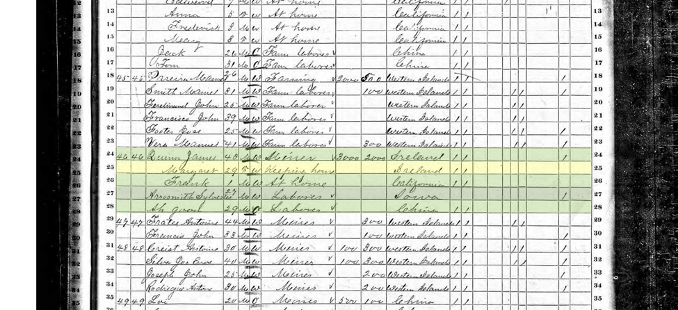 In this census James lists his occupation as “miner”. This census also shows that James had two laborers, one from Iowa and the other from China.