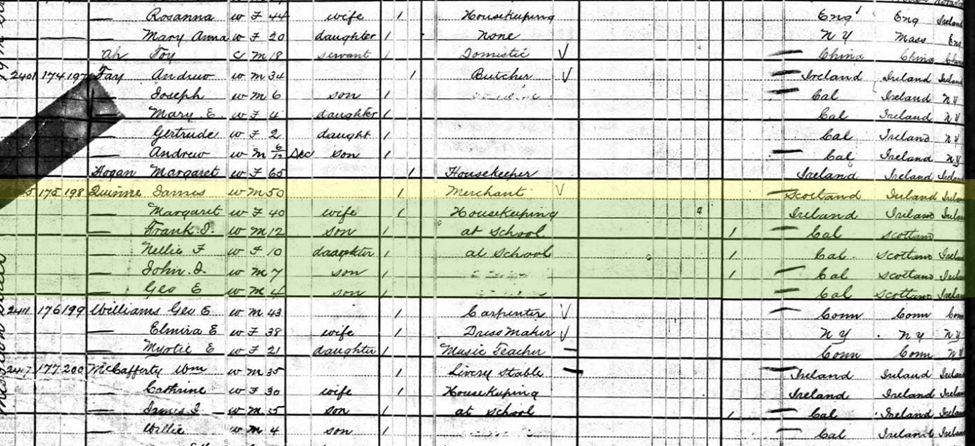 This census also has one unique feature, James lists his birthplace as Ireland while all other documents list it as Scotland.